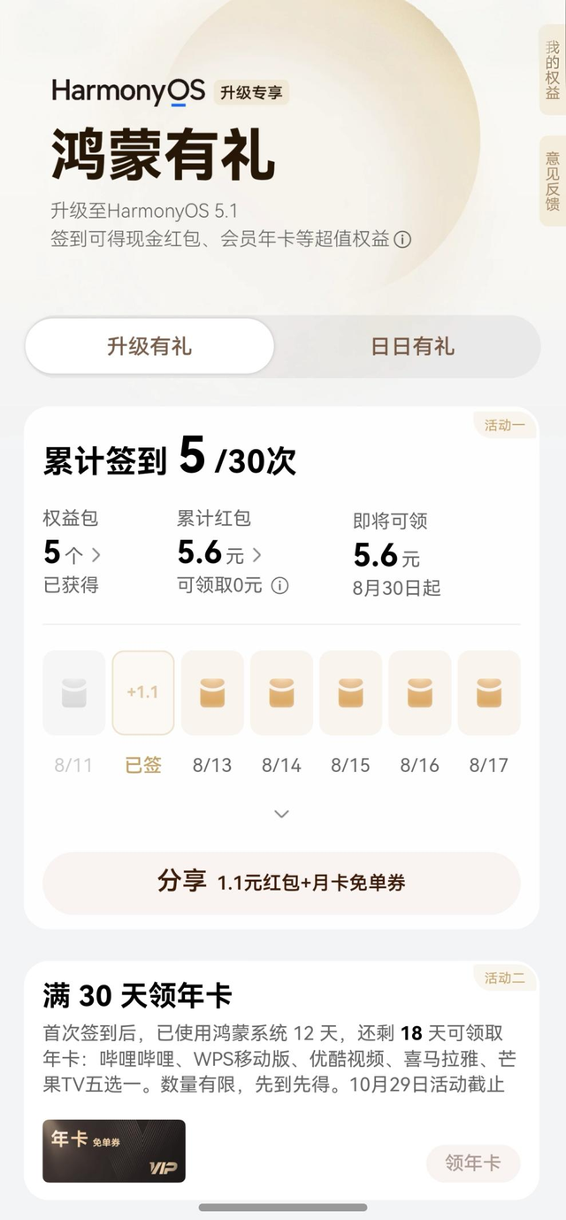 从桌面右滑进入负一屏,“鸿蒙有礼”吸引了我的注意。带着好奇点进去,活动页面清晰地展示着打卡就能领的丰富权益,这波操作比 618 满减还香!首次签到就弹出 B 站月卡免单券,这不巧了?我正纠结要不要充会员追《咒术回战 第二季》,直接兑换开冲!