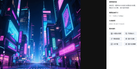 比如说,“请给我一幅带有未来感的夜景城市街景,霓虹灯光闪耀,城市宣传海报”之类的,AI就会为你创造一张独具特色的、清晰度高的海报。
