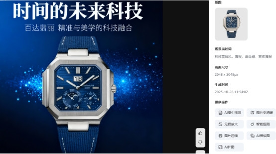 只需上传你的产品图,然后描述一下你需要什么的海报就可以了,比如“科技蓝调风,海报,高级感”等等。AI即可为你的产品生成一张海报。