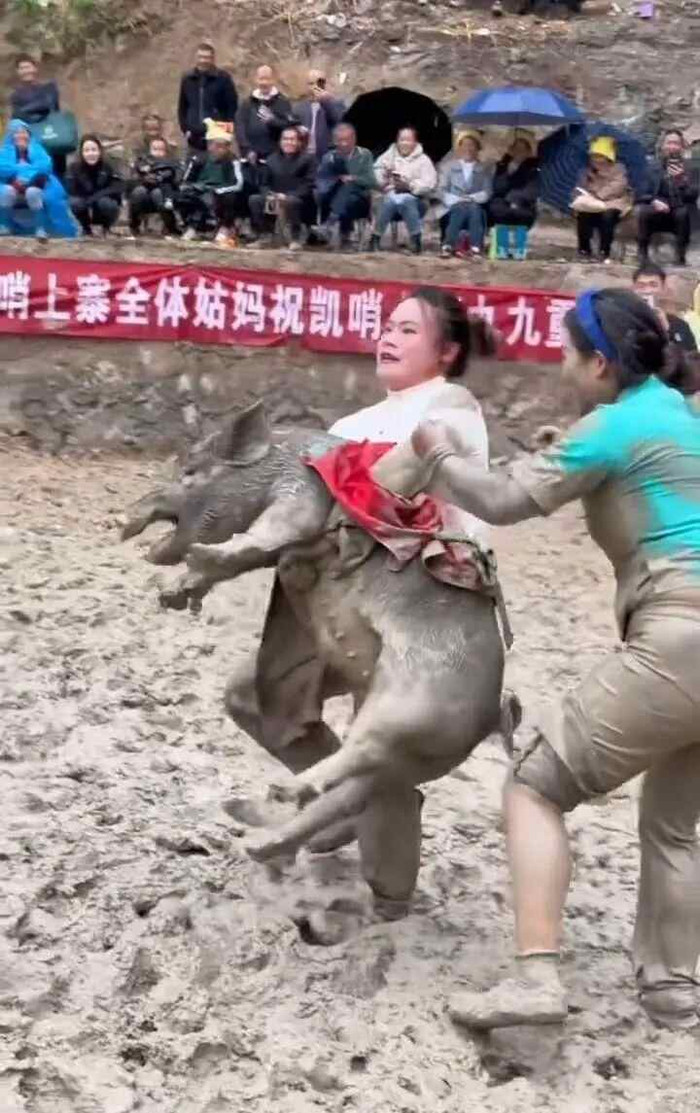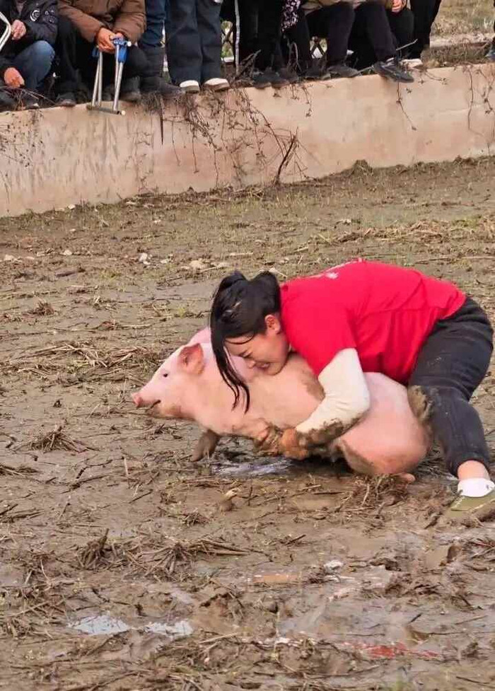 抓猪有什么诀窍?文凤琴说:“速度一定要快,跑过去压在它身上,稳住不松手。等它不挣扎了,再把它抱起来走到终点,这样才算自己的。要是中途脱手了,猪跑掉了,那它就是别人的了。”